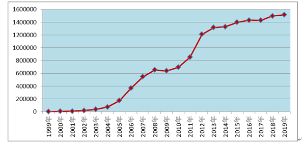 圖1 1999年-2019年全國(guó)藥品不良反應(yīng)/事件報(bào)告數(shù)量增長(zhǎng)趨勢(shì)