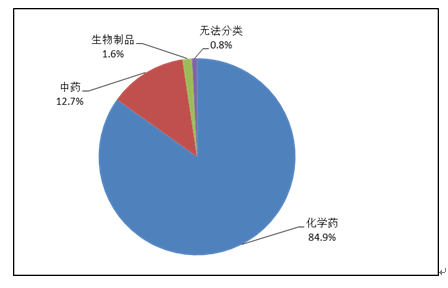 按照藥品類別統(tǒng)計(jì),化學(xué)藥品占86.6%,中藥占12.6%,生物制品占0.8%?;瘜W(xué)藥品排名居前的藥品類別是抗感染藥、心血管系統(tǒng)用藥、腫瘤用藥、神經(jīng)系統(tǒng)用藥、電解質(zhì)、酸堿平衡及營(yíng)養(yǎng)藥;中藥排名居前的藥品類別是理血?jiǎng)?、補(bǔ)益劑、祛濕劑、開竅劑、清熱劑。